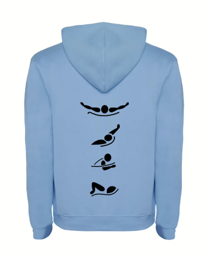 En la parte trasera, cuatro siluetas minimalistas representan los estilos clásicos de la natación: