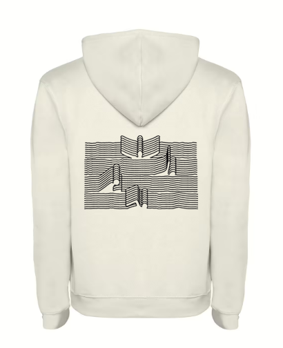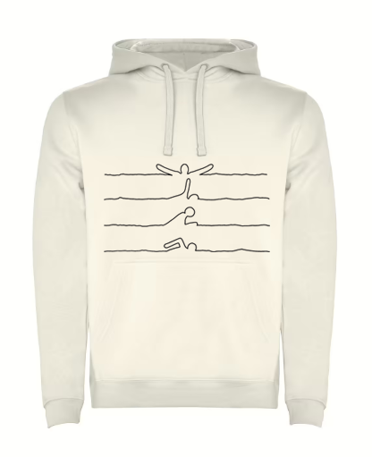 Tu corazón late al ritmo del agua. Este diseño único combina la línea de un electrocardiograma con la pasión por la natación: la onda cardíaca se transforma en los cuatro símbolos de los estilos de natación —mariposa, espalda, braza y crol— integrados en la gráfica como si fueran picos y valles del latido.
